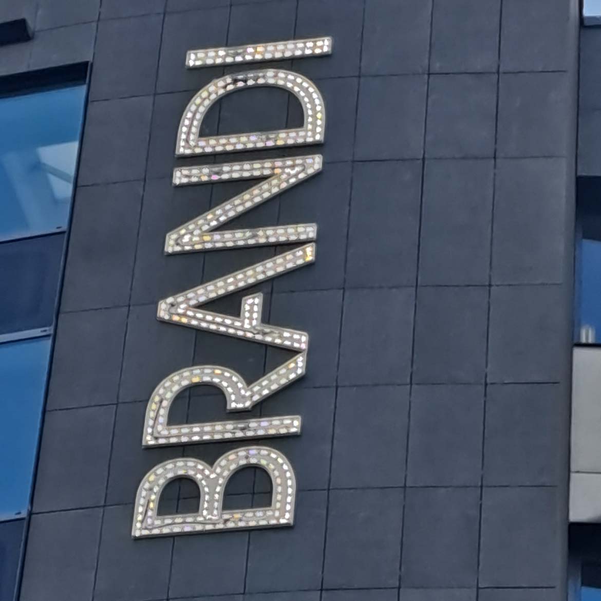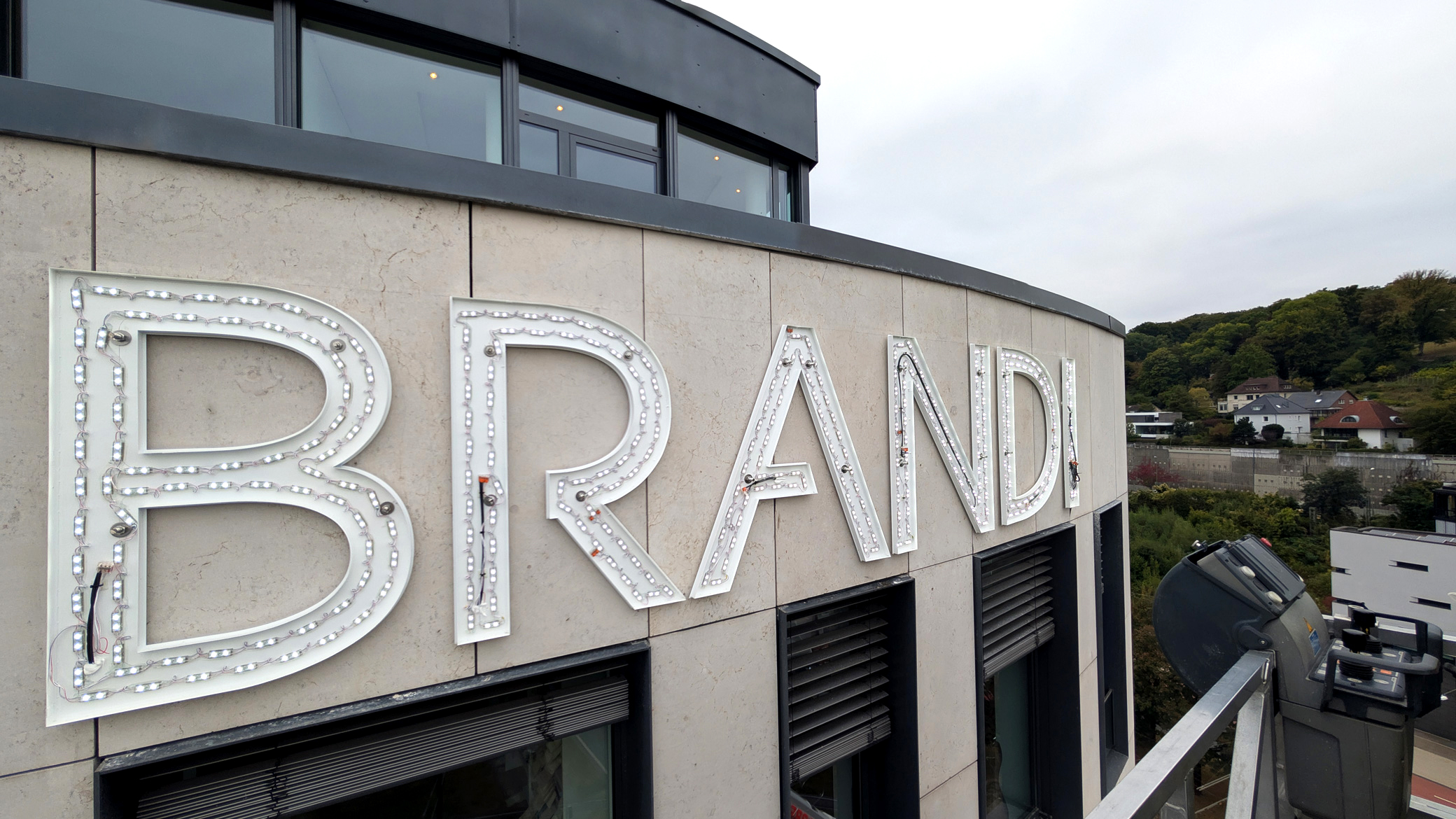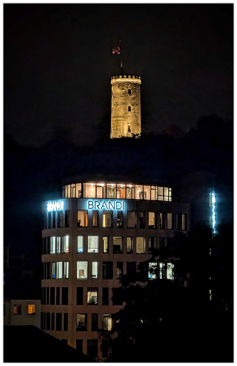 Der vertikale Schriftzug „BRANDI“ (Ansicht Gadderbaumer Straße / Johannistal) wurde in Acrylglas Profil 8 gefertigt und frontseitig mit Edelstahlspiegeln, gebürstet Korn 240, veredelt. Die imposanten, rund 5,6 Meter hohen Leuchtbuchstaben sind auf weiß pulverbeschichteten Aluminiumrückwänden montiert, die das Licht optimal reflektieren.