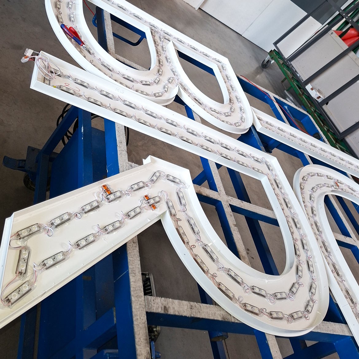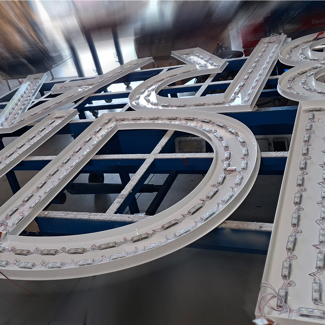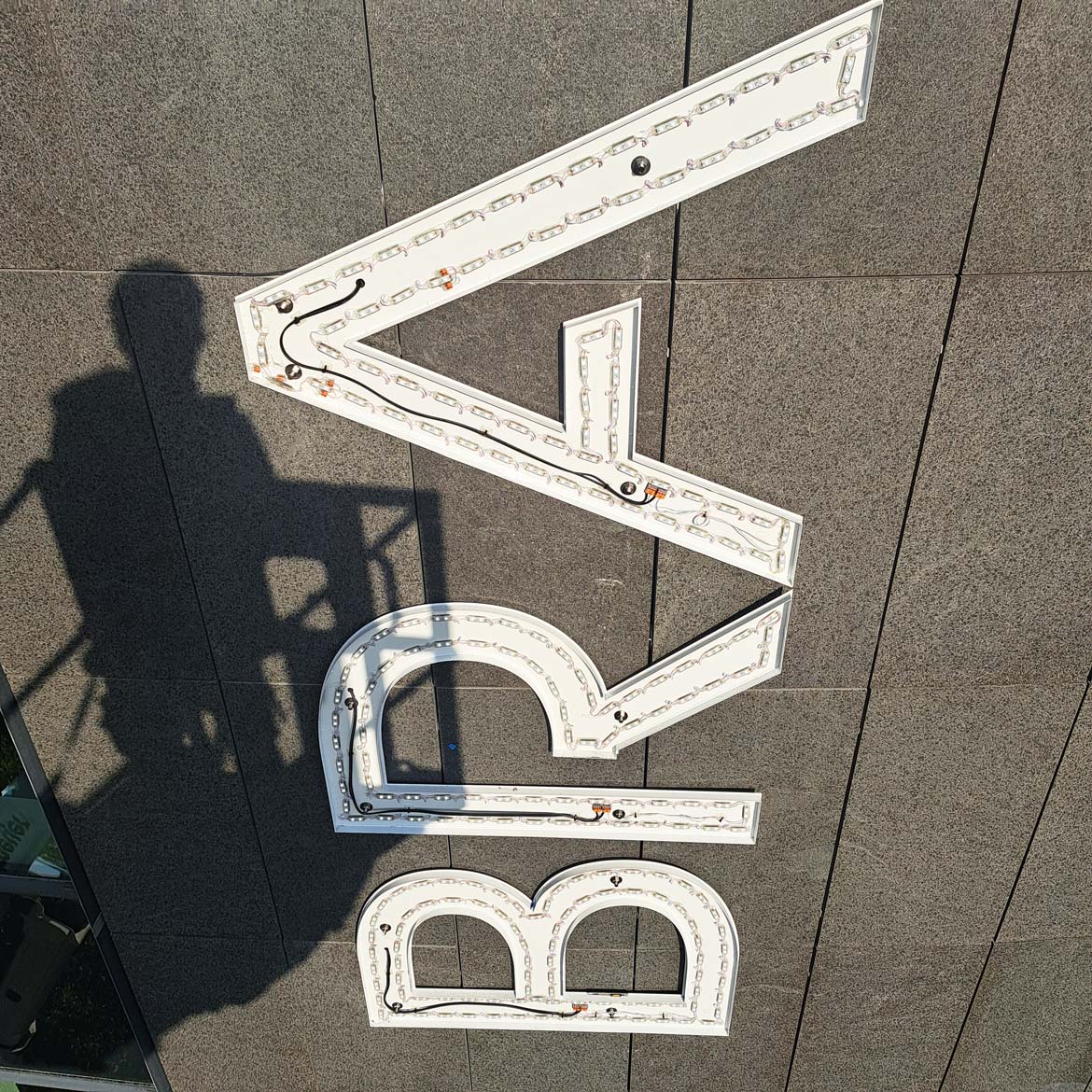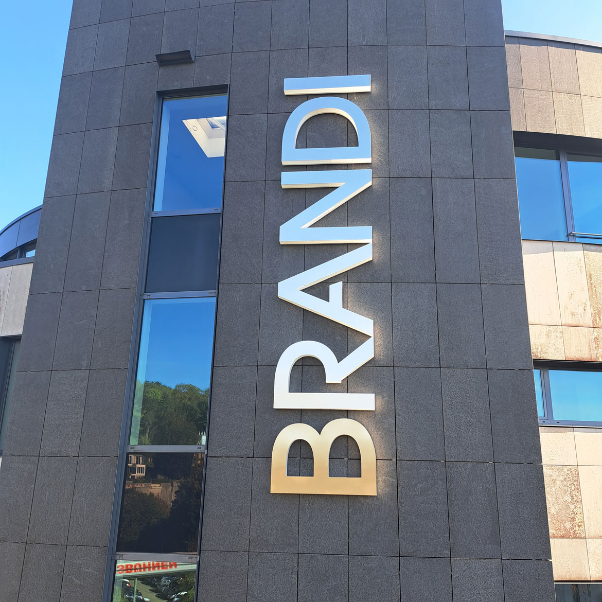 Zwei waagerechte Schriftzüge ergänzen das Gesamtbild, sind jeweils ca. 4,7 Meter lang und bestehen ebenfalls aus Acrylglas Profil 8 mit Aluminiumspiegeln sowie einer individuellen Sonderlackierung nach Corporate Design.