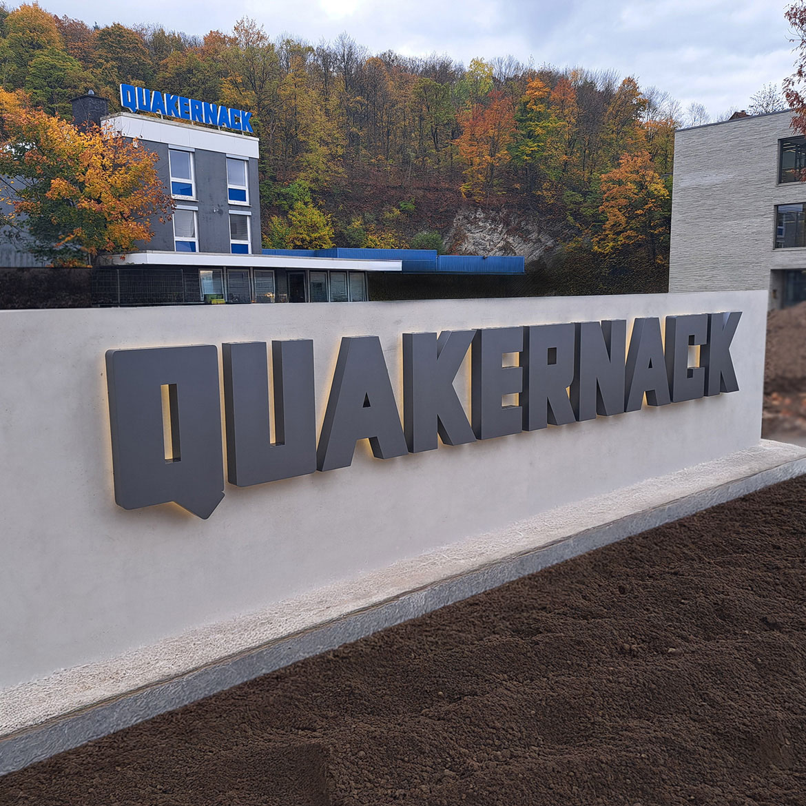 Für die Ludwig Möllmann GmbH & Co. KG realisierten wir zwei auffällige Rückleuchter-Projekte: den 3D-Leuchtschriftzug „QUAKERNACK“ mit Maßen 6.333 × 934/800 mm auf der Mauer und den Rückleuchter LOGO „Q“ mit einem Durchmesser von ca. 2 m an der Fassade.